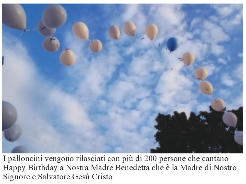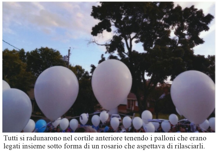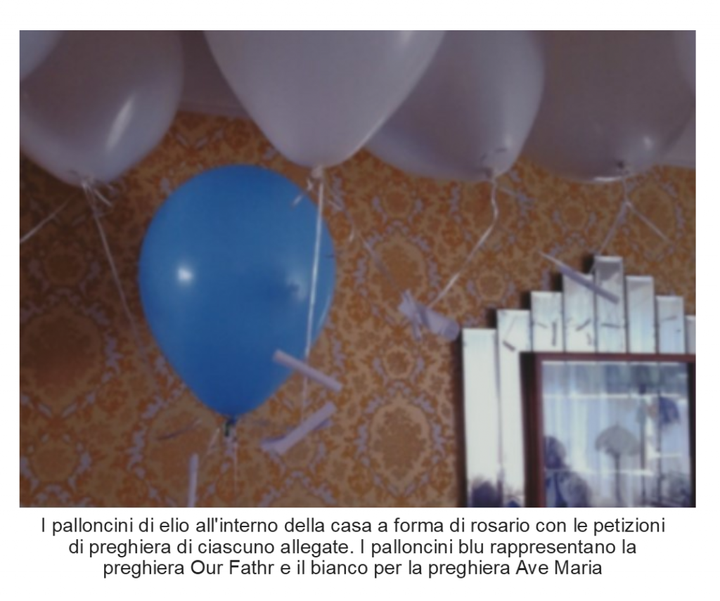 Alzando gli occhi verso il soffitto della casa di questa donna, ho visto diversi grandi palloncini blu e bianchi legati insieme a forma di Rosario. I palloncini blu che rappresentano la preghiera del Padre nostro e il bianco per la preghiera di Ave Maria. Su un tavolo c’erano piccoli pezzi di carta con una corda attaccata a ciascuno e tu hai scritto la tua petizione di preghiera a Nostra Madre, poi l’hai legata a una delle corde sui palloncini. Poi sono entrato nel cortile sul retro e hanno allestito grandi tende e sedie per ognuno.