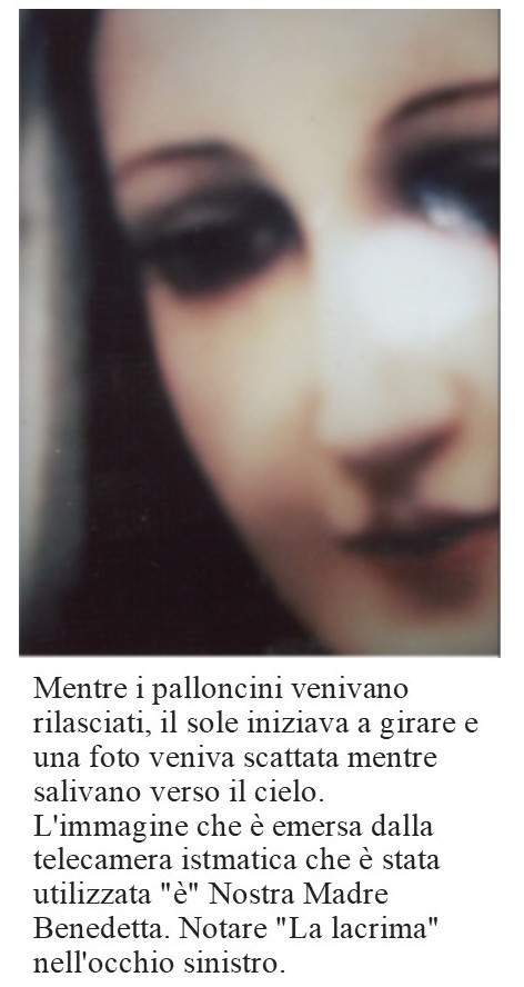 Alzai lo sguardo e vidi Neil nella finestra della camera da letto su per le scale e la finestra era spalancata e stava facendo delle foto mentre i palloncini salivano verso il cielo. Quando tutto questo stava accadendo, il Sole stava girando e alcune persone stavano dicendo: “Guarda il Sole!” Entrai in casa e salii le scale, camminai nella camera da letto dove si trovava Neil. Neil ha appena scattato una foto usando una fotocamera instamatica mentre i palloncini stavano ancora salendo, poi si è voltata verso di me e ha detto: “Questo è il tuo.” Ho visto l’immagine apparire di “Madonna della lacrima di gioia” nella foto. Non c’erano immagini di Nostra Madre su nessuno dei palloncini né sugli alberi, né in nessun luogo.