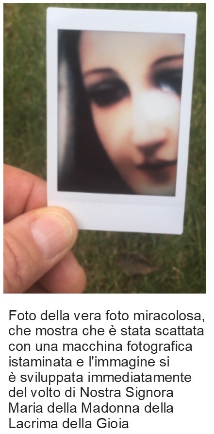Alzai lo sguardo e vidi Neil nella finestra della camera da letto su per le scale e la finestra era spalancata e stava facendo delle foto mentre i palloncini salivano verso il cielo. Quando tutto questo stava accadendo, il Sole stava girando e alcune persone stavano dicendo: “Guarda il Sole!” Entrai in casa e salii le scale, camminai nella camera da letto dove si trovava Neil. Neil ha appena scattato una foto usando una fotocamera instamatica mentre i palloncini stavano ancora salendo, poi si è voltata verso di me e ha detto: “Questo è il tuo.” Ho visto l’immagine apparire di “Madonna della lacrima di gioia” nella foto. Non c’erano immagini di Nostra Madre su nessuno dei palloncini né sugli alberi, né in nessun luogo.